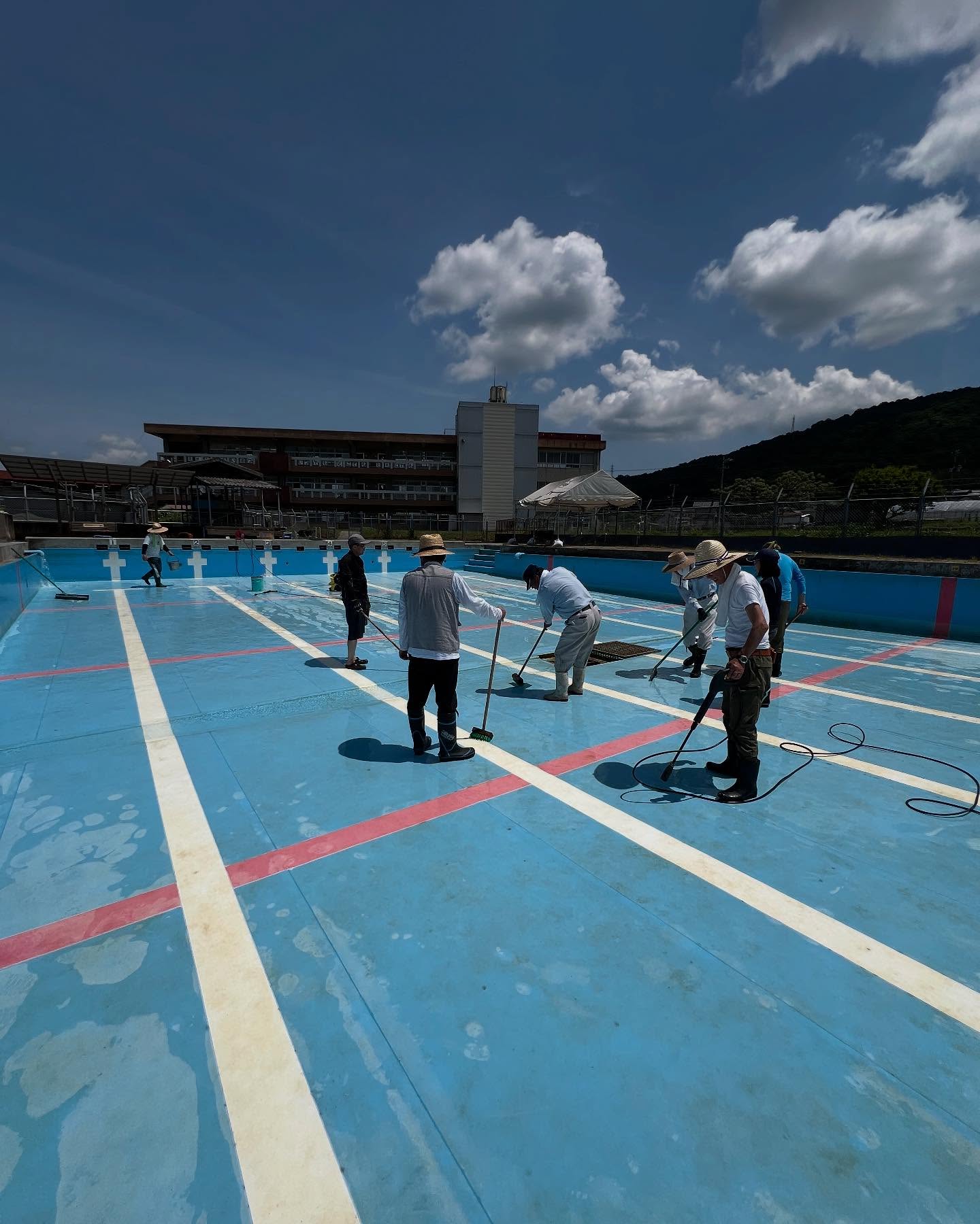 5月28日(水)は午前9時から吉田小学校のプール掃除です。地域の皆さん7名にお手伝いをお願いし、先生方といっしょに2時間プール底の汚れと格闘しました。なかなかハードでしたよ(^^;