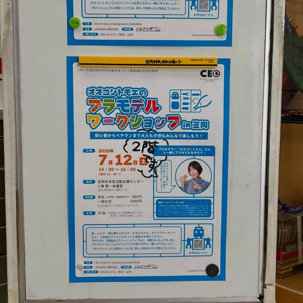 7月12日(土)は1日プラモデルの日でした。「オオゴシトモエのプラモデル ワークショップ in 笠岡」のサポートスタッフとして、午前・午後と動きました。プロモデラーのオオゴシトモエ先生のワークショップは、教育的な観点からの狙いもあり、どのようなワークショップになるのかとても楽しみでした。