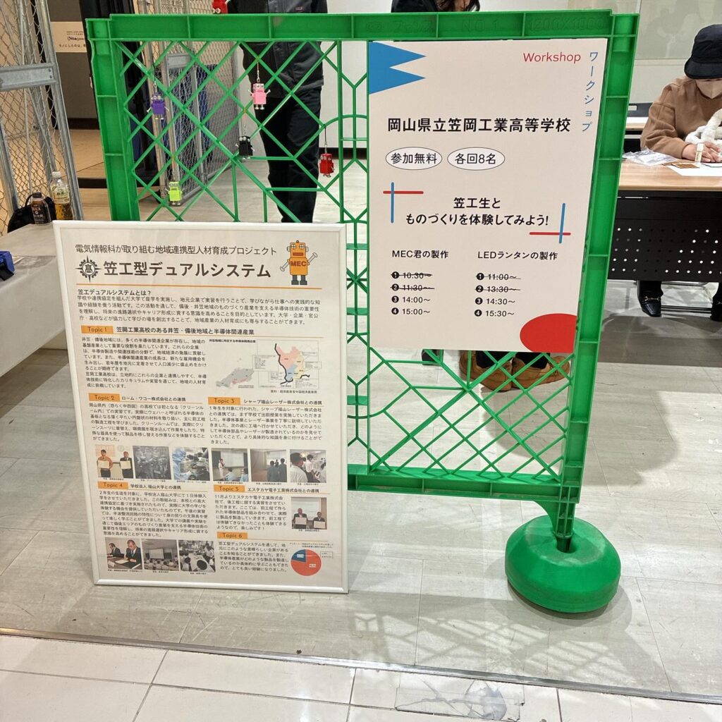 展示には、笠岡市から「タイラーデザイン事務所 & 六島浜醸造所」と「岡山県立笠岡工業高等学校」が参加。 笠岡工業高等学校の「組木細工風の LED ランタンを作ろう!」ワークショップをのぞいてみると、多くの子どもさんが楽しそうに参加していました。