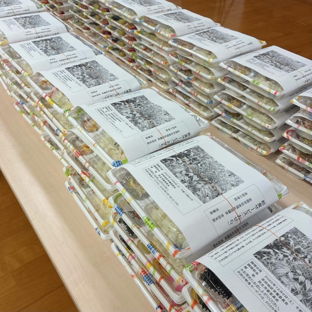 栄養委員、社協、民生委員の皆さんと共に、師走らしい「おせち風弁当」を150食作りました。