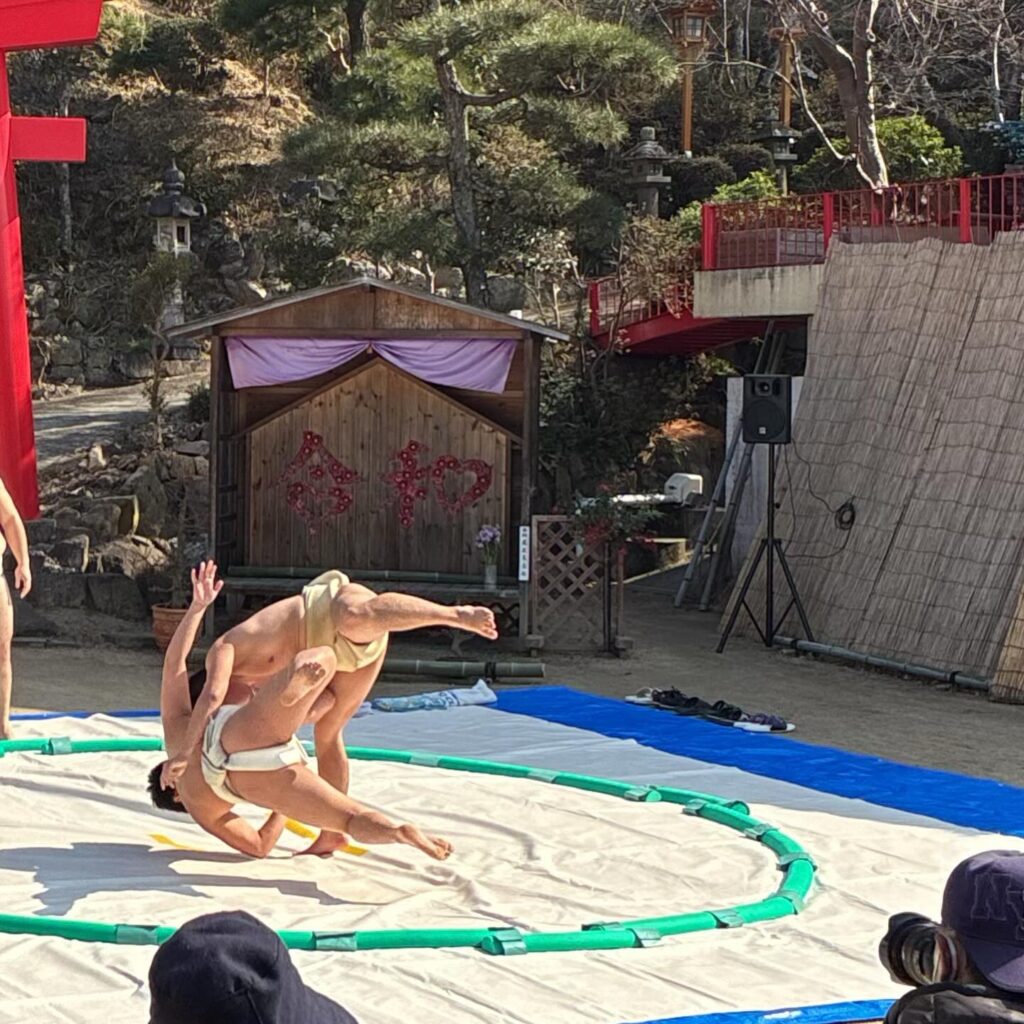 午後は白雲大社へ移動し、人権文化祭から駆けつけられた坂本県議とともに、13時からの「奉納相撲」を観覧しました。今回の奉納相撲は、広島県立竹原高等学校相撲部の皆さんによるものです。