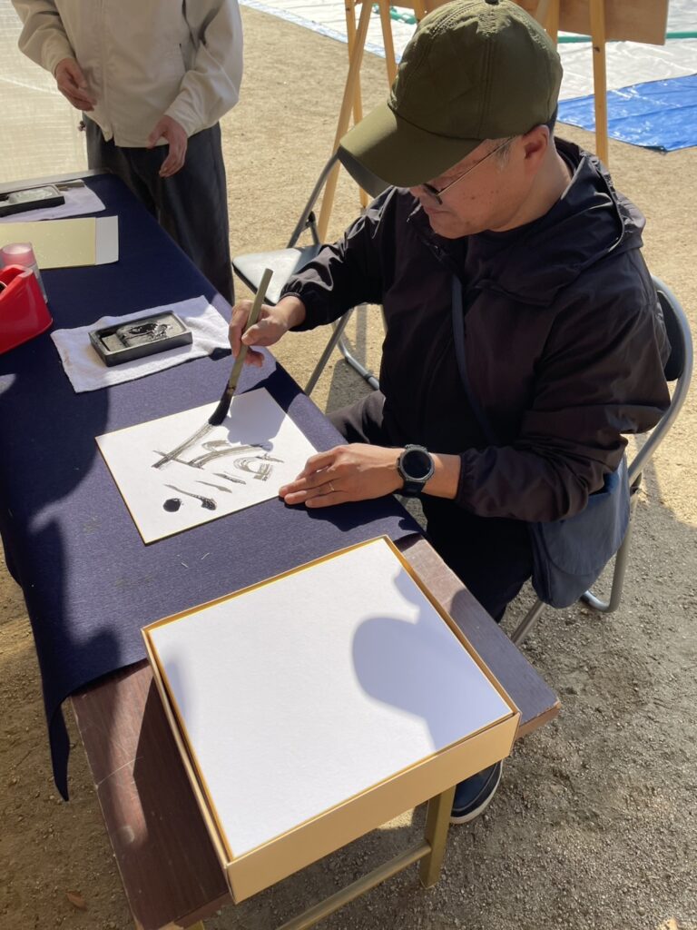 書道パフォーマンスの後に「竹筆ワークショップ」に参加し、色紙に書をしたためました。